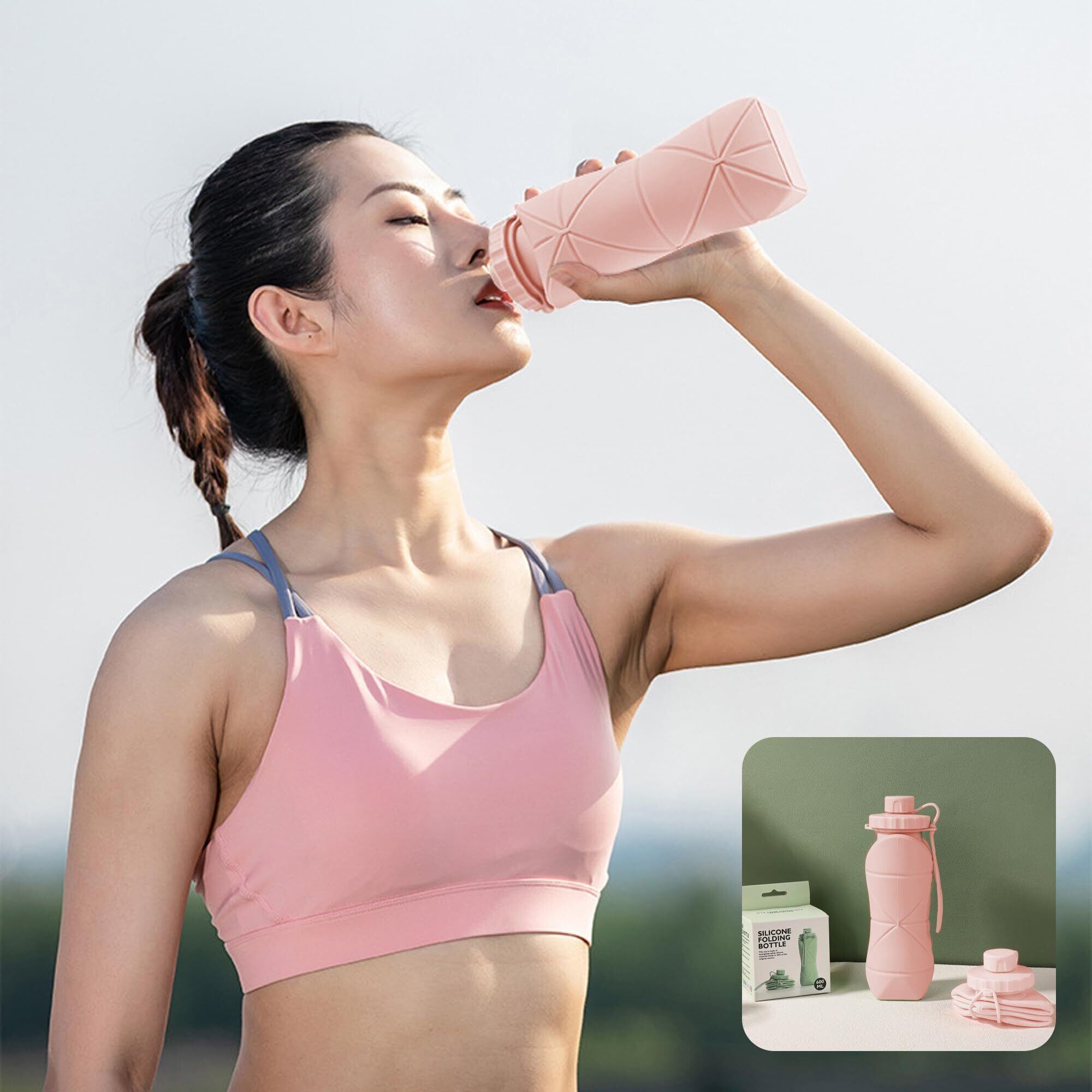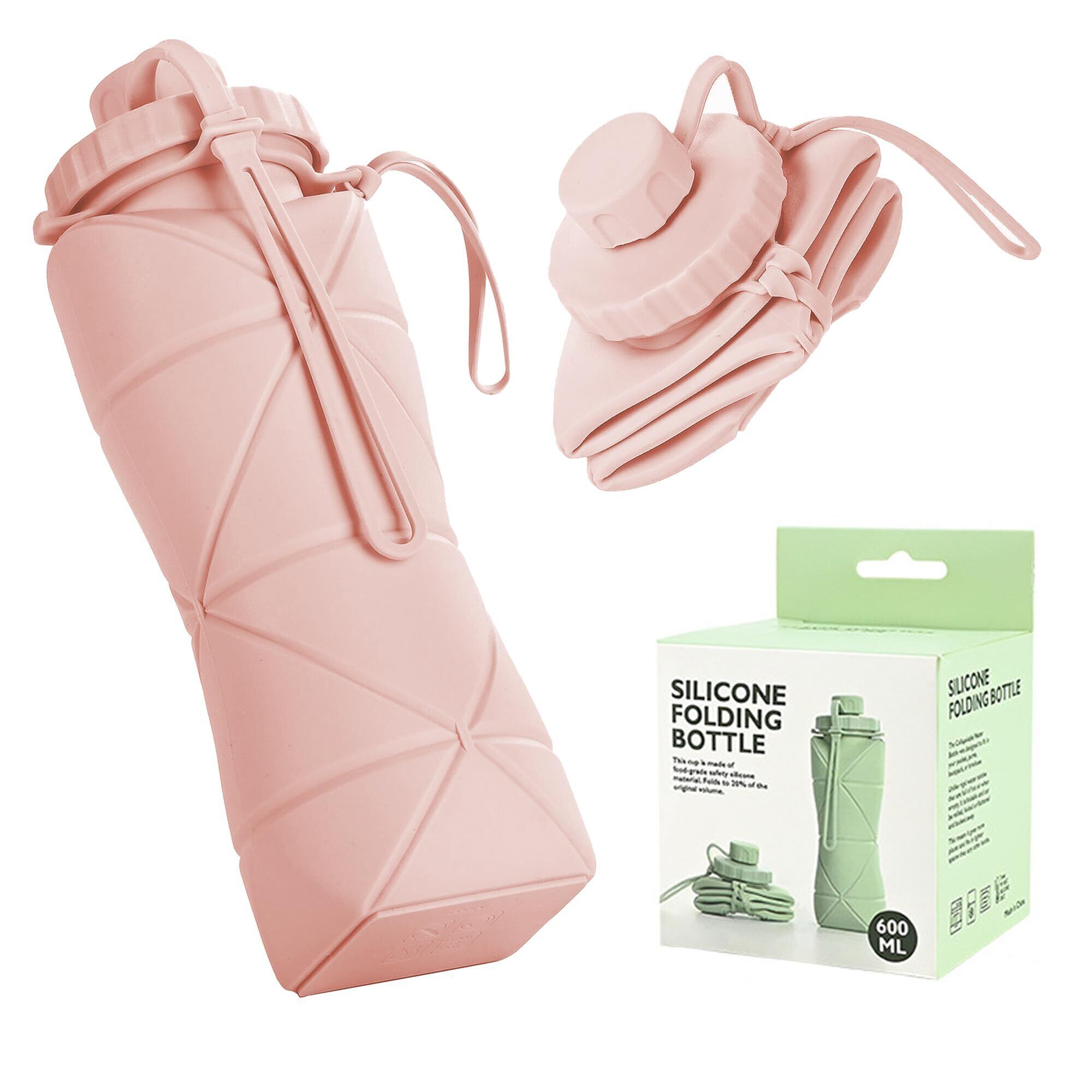 600ML 折りたたみカップ シリコンウォーターボトル 折りたたみマグカップ 蓋付き アウトドア/ピクニック/旅行/日常使用 携帯便利 耐熱 多機能 スタイリッシュ(ピンク、600ml)