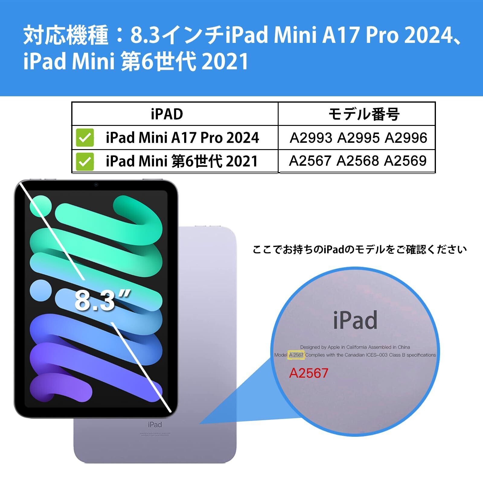 対応機種:iPad Mini A17 Pro 第7世代 2024(モデル番号:A2993 / A2995 / A2996)、iPad Mini 6 2021発売 8.3インチ(モデル番号:A2567 / A2568 / A2569)他のモデルには対応しません。 ご購入前にモデル番号をご確認いただきます。