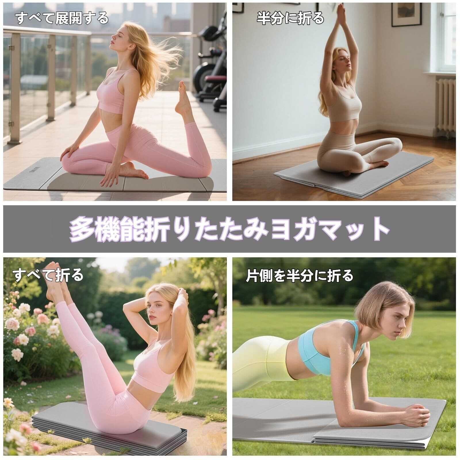 折りたたみ式で持ち運びやすいヨガマット。高品質TPE素材を使用し、柔らかく快適な使用感と優れた耐久性を実現。両面の滑り止め加工で安定感抜群、防水仕様でお手入れも簡単です。8mmの厚みで、ヨガやストレッチ、瞑想など幅広く活躍。折りたたむとヨガブロックやクッションとしても使えます。男女問わず使いやすいデザインで、プレゼントにもおすすめ。