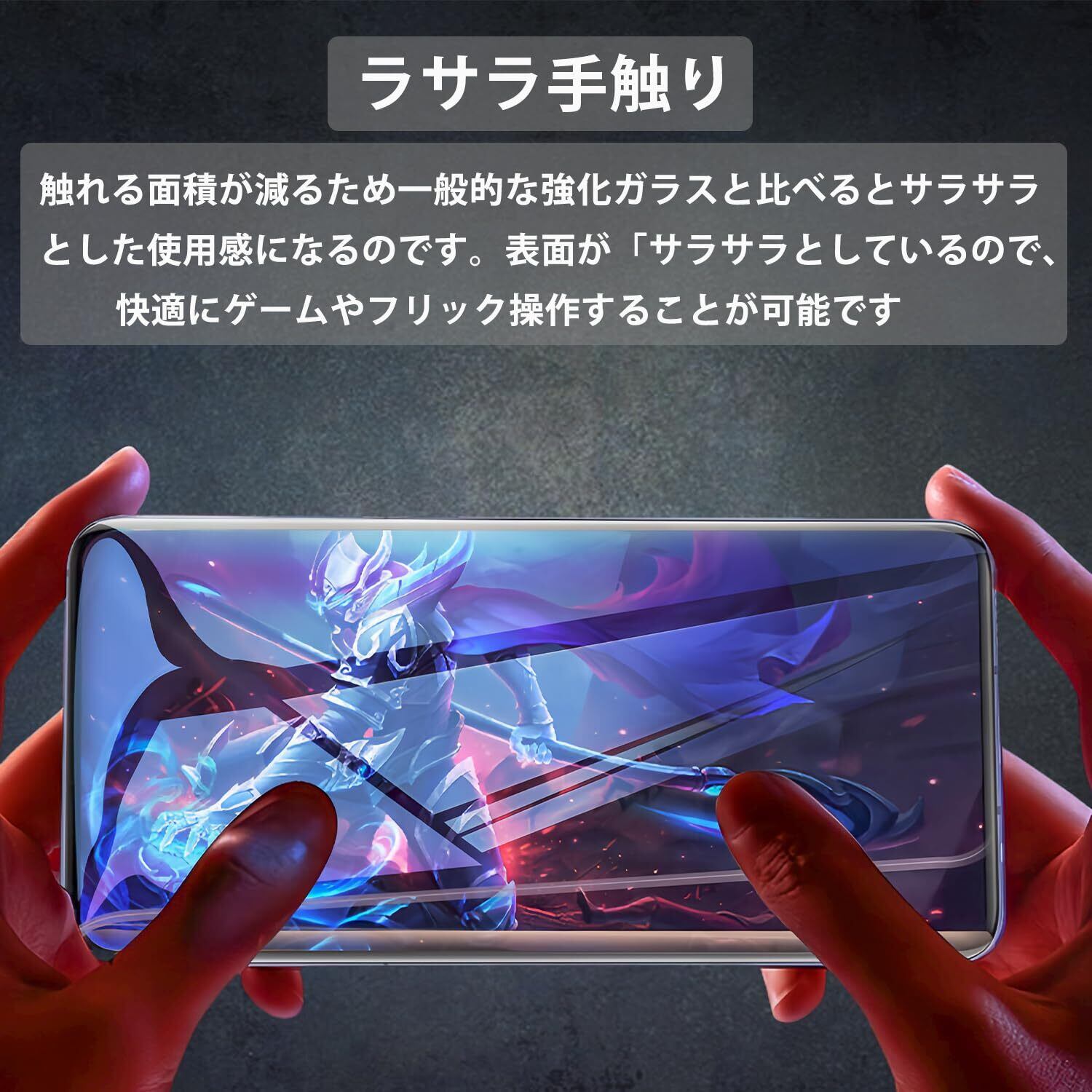 【サラサラ手触り】表面を顕微鏡で見ると、スクラブ保護フィルムはボコボコと凹凸が見えます。この凹凸は人間の指では段差として感じることはなく、触れる面積が減るため一般的な強化ガラスと比べるとサラサラとした使用感になるのです。表面が「サラサラ」としているので、快適にゲームやフリック操作することが可能です。