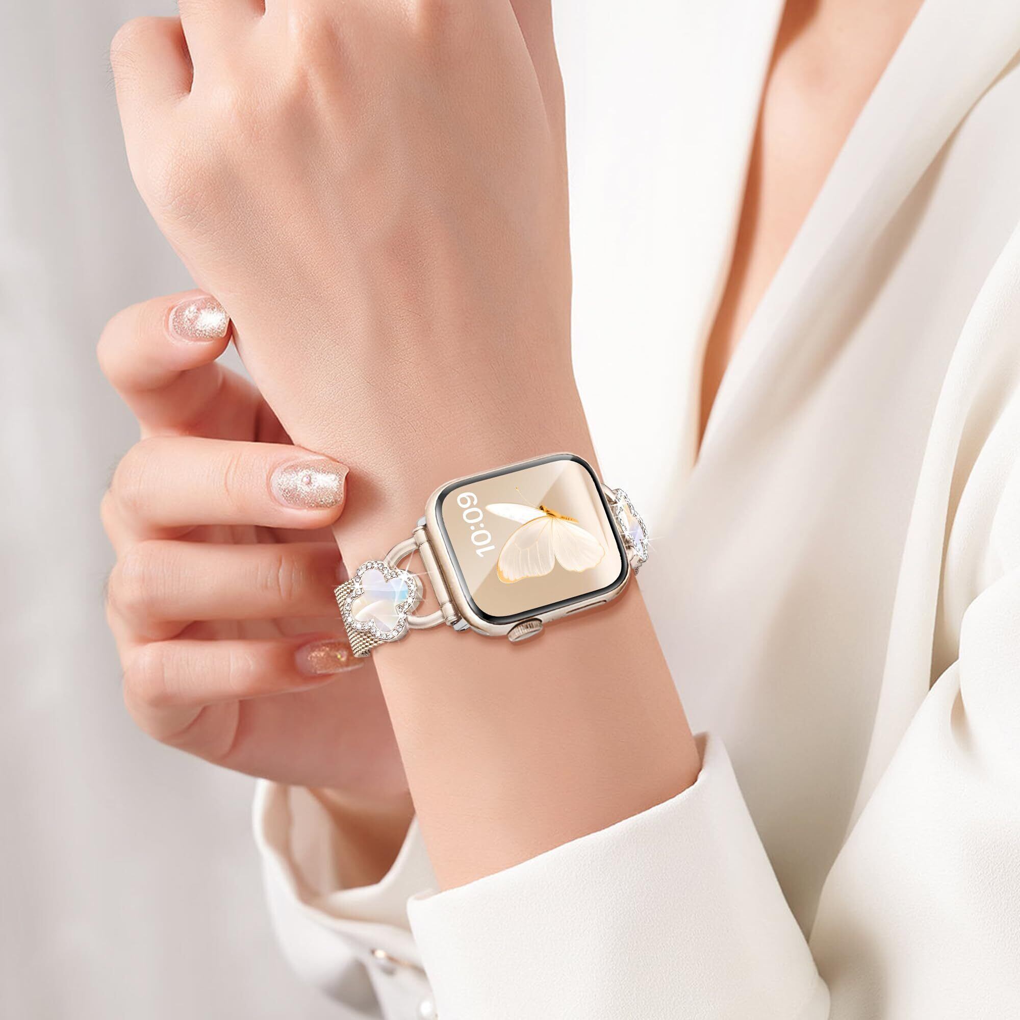 【洗練された贅沢な四つ葉のクローバー】このバンドは、四つ葉のクローバーとクラシックなミラネーズ編みを組み合わせ、優雅で幸運を感じさせるデザインに仕上げました。四つ葉の縁には輝く宝石があしらわれ、華やかで贅沢な印象を与えますアップルウォッチ バンド。細部までこだわり、控えめでありながらも上品な魅力を放ち、独自のセンスを求めるあなたにぴったりです。